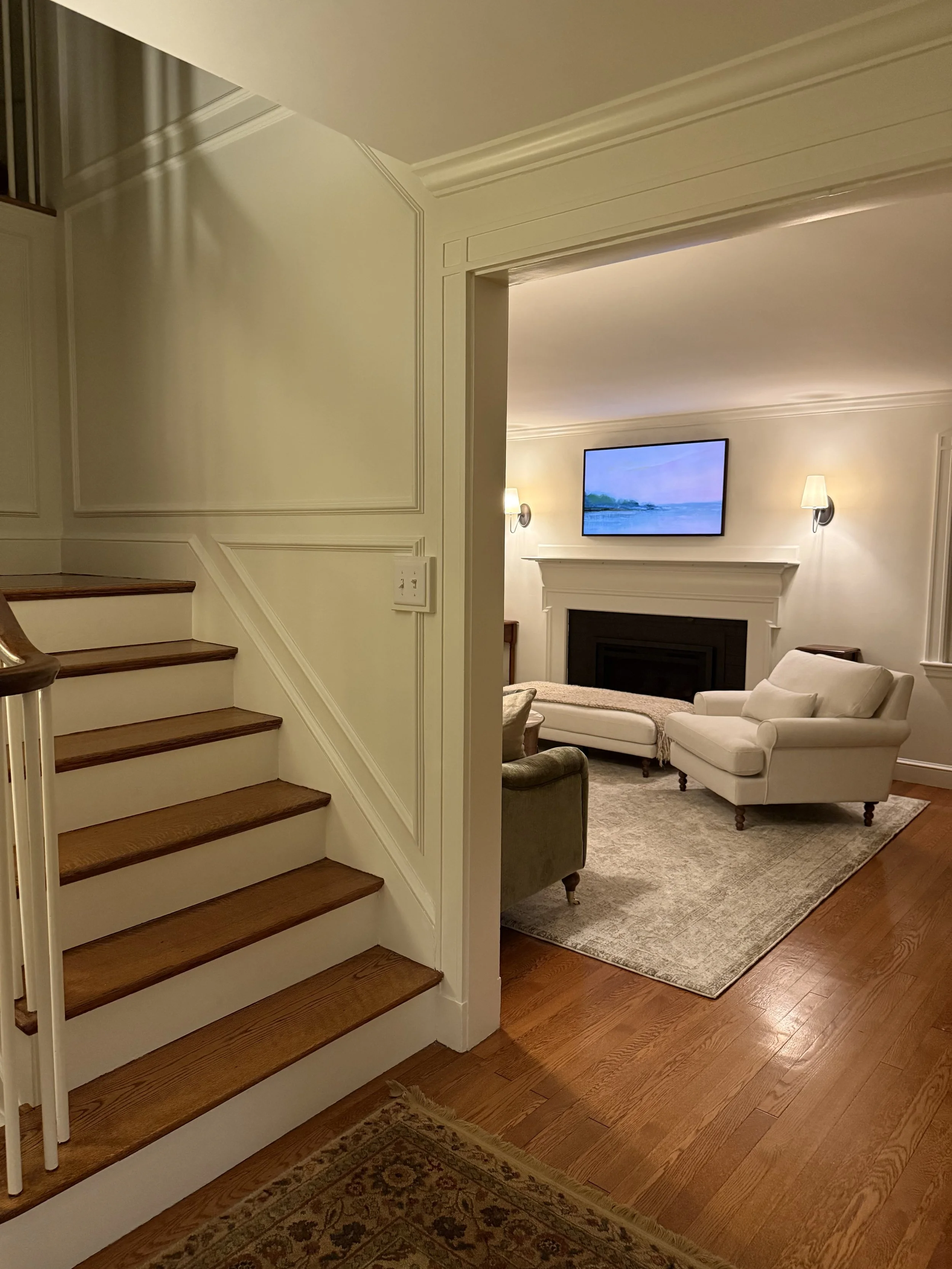 Historic Home Interior Renovation, Private Residence, Milton, MA, 2025: Interior design selections (paint, furniture, fixtures, accessories) and general contractor management (Home Perfection, LLC, Plymouth, MA). Scope included mechanical upgrades, lighting, audio-visual systems, and historic preservation work — slate roof, copper flashing, original window restoration, and new garage doors.